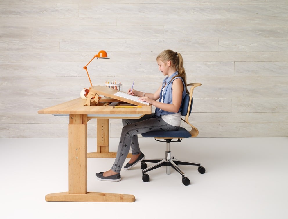 Einzigartig flexibel ist der MOBILE Schreibtisch. Die Arbeitsplatte ist fix oder partiell neigbar und so von Lernen bis Malen einsetzbar. Die Tischhöhe ‚wächst‘ mit dem Kind dank der verschiedenen Rasterhöhen. Rollcontainer und Laden mit Inneneinteilung schaffen Ordnung. Das robuste Buchen- oder Erlenholz nimmt auch erste Zeichenversuche nicht übel. Mit dem Pflegeset ist alles schnell gereinigt.